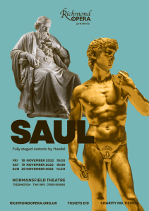 Saul, a fully-staged oratorio by Handel, with Baroque Orchestra at the Normansfield Theatre, Teddington. TW11 9PS.